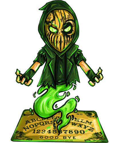 During this seance, multiple recording devices and cameras were set up. Not much is known what happened next, as all 7 researchers went missing. All of the recording devices were blank, and all traces of the encounter were gone – except the board itself, and one blurry photo that appeared to show a glowing green masked entity.